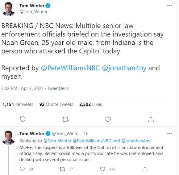 What we know about us capitol attack suspect. Green, who is now deceased, was a follower of the nation of islam and referred to himself as brother noah x. noah green, 25, originally from indiana. The cbs affiliate in indianapolis reported tonight that green filed a petition in marion county court on december 8, 2020 to change his name from noah ricardo green to noah zaeem muhammad. Police didn't indicate in a news conference shortly after the attack or in news releases anything about green's political views or nation of islam opinions. Green was armed w/a large blade when he was shot dead.